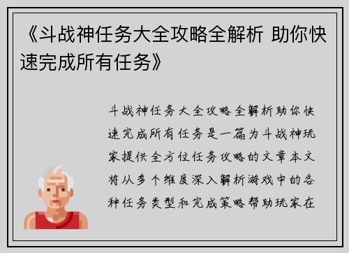 《斗战神任务大全攻略全解析 助你快速完成所有任务》
