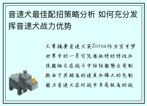 音速犬最佳配招策略分析 如何充分发挥音速犬战力优势